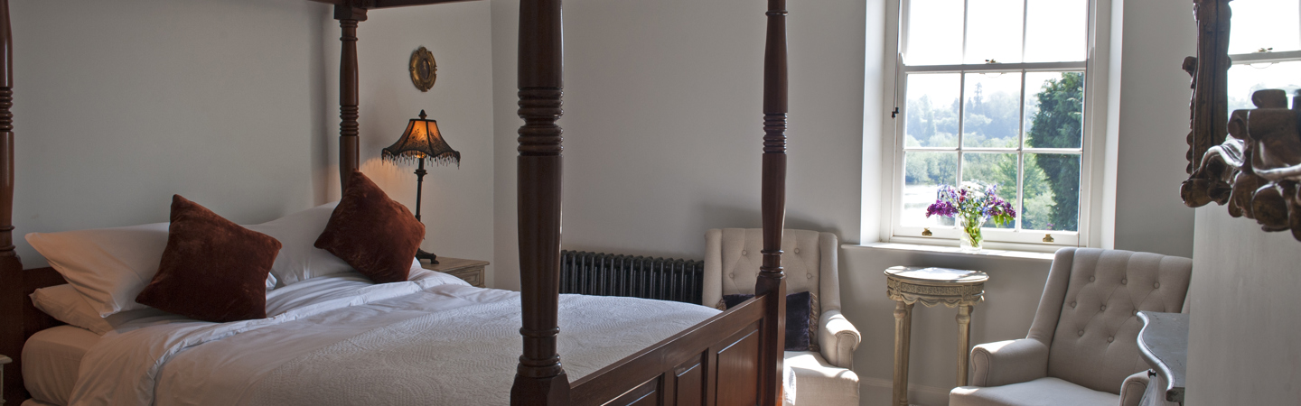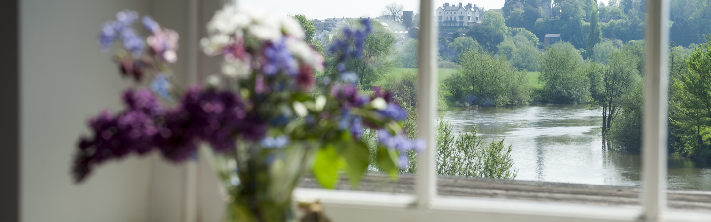 An elegant room with a four poster king sized bed. It benefits from fantastic views of the river Wye looking towards the centre of Ross with the towering spire of St. Mary’s Church dominating the skyline.
