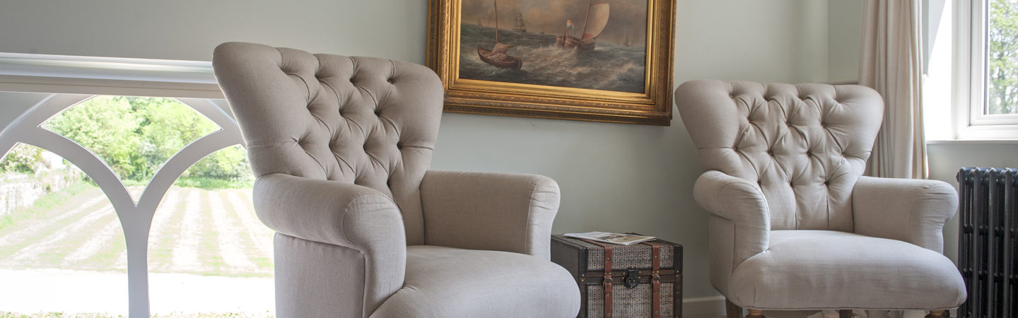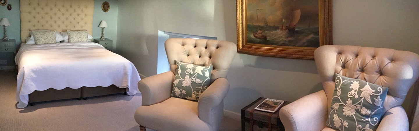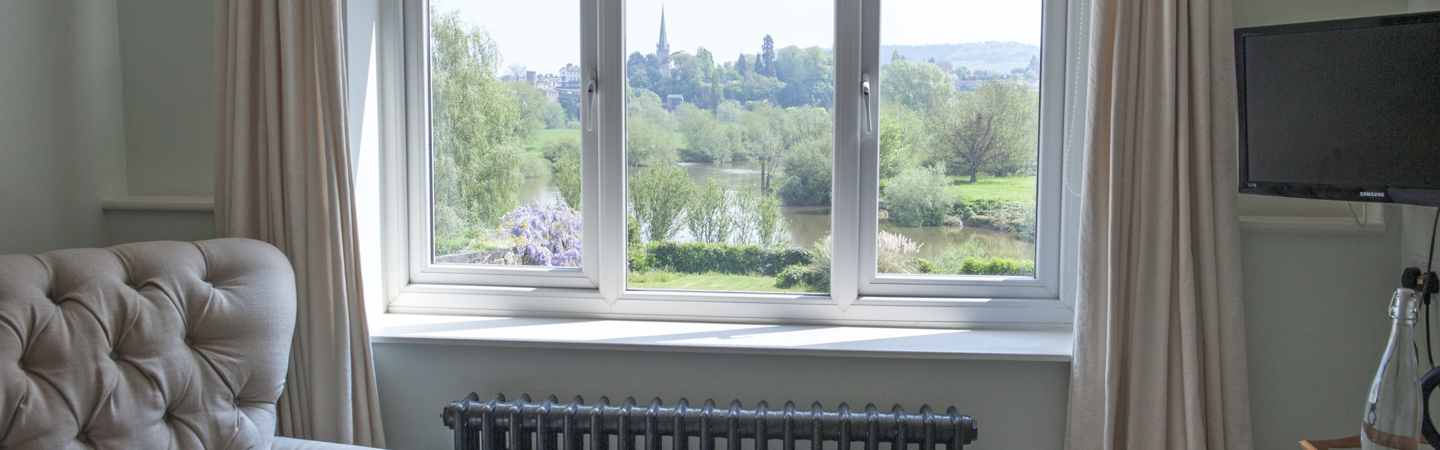 This room has fantastic panoramic views across the garden to the river Wye and twelfth century Wilton Castle. This dual aspect room also has a king size bed and a large seating area.